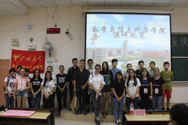 2015年“发现广大之美”新生演讲比赛决赛在文新113顺利举行。出席本次演讲比赛的嘉宾有学工办主任兼12级辅导员顾书老师,院团委书记兼13级辅导员杜亚辉老师,14级辅导员胡啟岚老师,15级辅导员陈启彪老师以及团委副书记梁碧、刘奕泠,学生会副主席邓文杰,秘书长钟伟君。