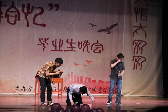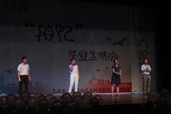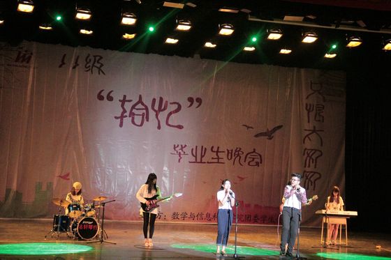 发言完毕后,节目继续。同为吉他协会的数院11级钟一鸣同学的一曲《那些花儿》道出了每一位即将毕业同学的心声,感人至深。在伤感之后,放映了微电影《拾忆》,电影里那一幕幕的场景都是我们所经历,所怀念的瞬间。在欢笑之余,也触发了大家的不舍之情。微电影之后顾书老师、杜亚辉老师、胡啟岚老师、陈启彪老师为我们带来了一首《十年》,观众席上喝彩声不断,大家意犹未尽,这首歌却已结束。陈启彪老师在献唱完歌曲之后为11级的同学们献上了自己最真挚的祝福。数院艺术团话剧队的同学们在老师发言之后献上了话剧《救赎》,数院2012级代表献上了舞蹈Only one,使全场的气氛再一次的高涨起来,校十佳歌手陈铭俊同学协同他的小伙伴们为大家带来了一首《雨中的告别》,全场欢呼声不断,随后AC舞蹈协会为我们带来了《Alright》的舞蹈,气氛十分高涨。在带感的舞蹈结束之后,李恒静同学作为11级毕业生代表发表了自己的感想并播放了她制作的《时光机》视频,向大家包括她的家人分享了自己这4年的点点滴滴,并感谢一路上有他们的陪伴。随后精彩的节目继续,数院艺术团舞蹈队为我们带来了舞蹈《咏春》,杜浩楠同学与校话剧队的同学们为观众献上了话剧《落叶归根》,爆笑之后,晚会也即将接近尾声,数院132班的同学们为毕业生们带来了一首《夜空中最亮的星》,为11级毕业生晚会拉上完美的帷幕!