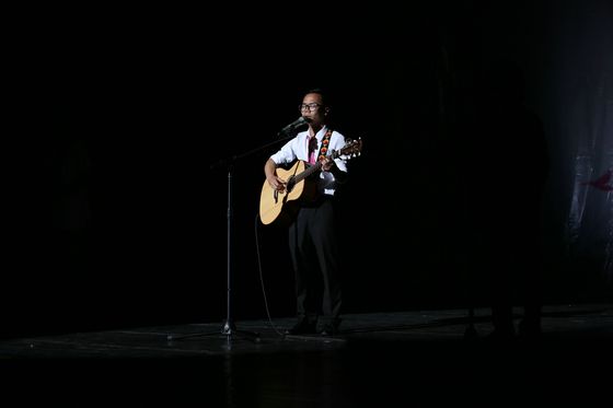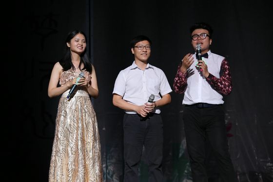 晚会在一曲《给所有知道我名字的人》中拉开序幕,器乐队与歌咏队卖力的表演,带动了全场的气氛。歌曲结束后,主持人致辞,随后邀请了何建勋教授上台讲话,老师的话语鼓舞了在场的每一位同学,相信明天,数院将会以每一位数院学子骄傲。