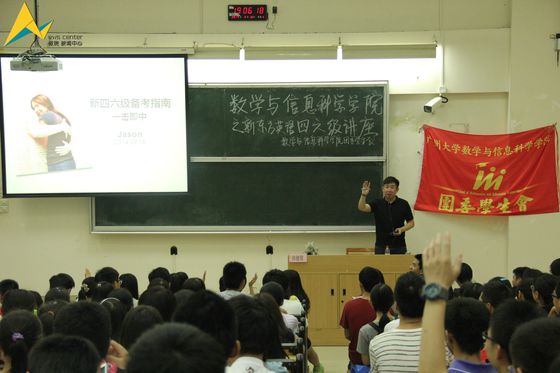 主办的英语四六级讲座在文新楼211举行。讲座由新东方讲师帅健翔(Jason)老师主讲,帅老师曾参与多本重要教材编写,擅长单词记忆教学,阅读理解教学及英语演讲辅导。在讲座中,帅老师就大学生备考英语四六级遇到的问题作了详细而深刻的解答,以幽默风趣的语言为同学们讲述英语四六级备考方法和技巧,例如:如何高效率背英语单词和突破英语听力等。参加讲座的多为大一新生,但其中不乏大二大三的学生,整个教室座无虚席,同学们都听得非常投入,还时常与老师互动,可见大家对四六级考试的注重。机会留给有准备的人,希望同学们能把从讲座中学习到的备考方法和做题技巧运用到平常的练习当中,相信大家的英语水平一定能有质的飞跃。 预祝各位同学在接下来的四六级考试中取得好成绩!