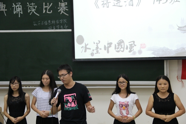 在第一个环节中,数学152班的一首《我是一个任性的孩子》将我们的记忆带回到童年,任性地耍着自己的小脾气。信安151班充满激情、气势雄壮的朗诵和丰富的肢体语言唤醒了我们心底少年强则国强的意识,并以全场最高分居第一环节的第一。数学141班富有气势地朗诵了《将敬酒》,而数学143班则以一种诙谐的方式朗诵此诗。在第一环节结束后,杜老师现场朗诵的《滕王阁序》给我们带来了一个大大的惊喜,在这充满感情的朗诵中,现场的观众都被深深吸引了,以热烈掌声回应杜老师。