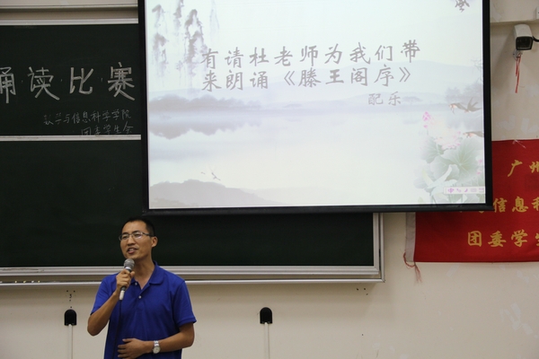 2014年“中华经典诗文朗诵”三等奖获奖者林政、现辩论队队长肖俊婷、获得2014年“发现广大之美”校赛二等奖于景任担任此次比赛的评委。本次比赛共分为三个环节,第一环节是配乐朗诵,第二环节是知识问答,第三环节是四强争霸。