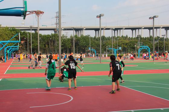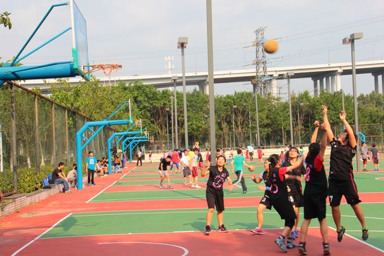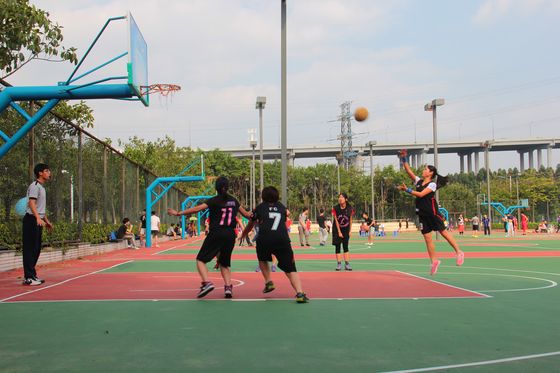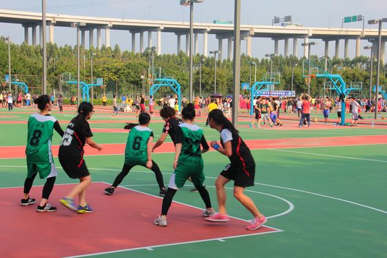 女子篮球队在梅苑篮球场3A号场,分别对战工商管理学院和音乐舞蹈学院。