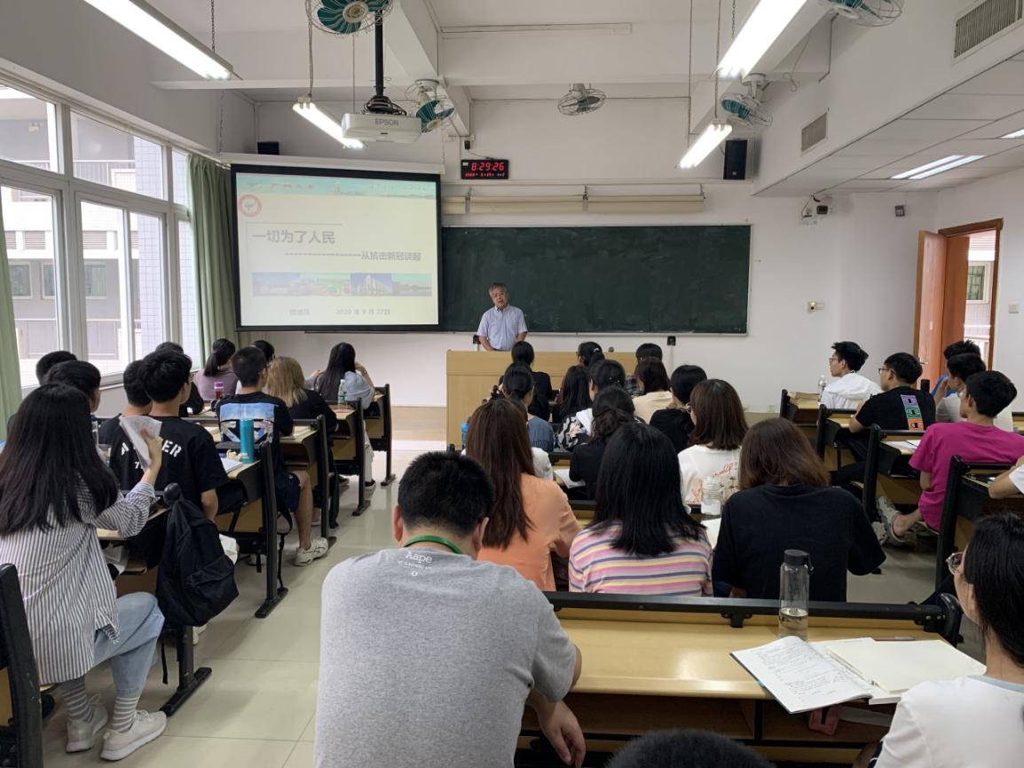 曹道民以本次新冠疫情为例,分别从“急人民之所急”“解人民之所困”“想人民之所想”三个层面向同学们梳理了疫情发生以后,党和国家为扭转疫情形势采取的一系列强有力的疫情防控举措,并通过对比分析国内外疫情发展形势,深刻剖析了中国共产党“以人民为中心”的发展思想和社会主义制度的优越性,并通过一个个感人事迹,向同学们诠释了党员先锋模范作用的精神内核,以及所有默默付出的普通民众在疫情中展现出的大无畏精神和强大民族凝聚力。最后,曹道民勉励同学们要珍惜时间,扎实学好专业知识,将来积极投身到祖国的建设中去,为中华民族伟大复兴贡献自己的力量!