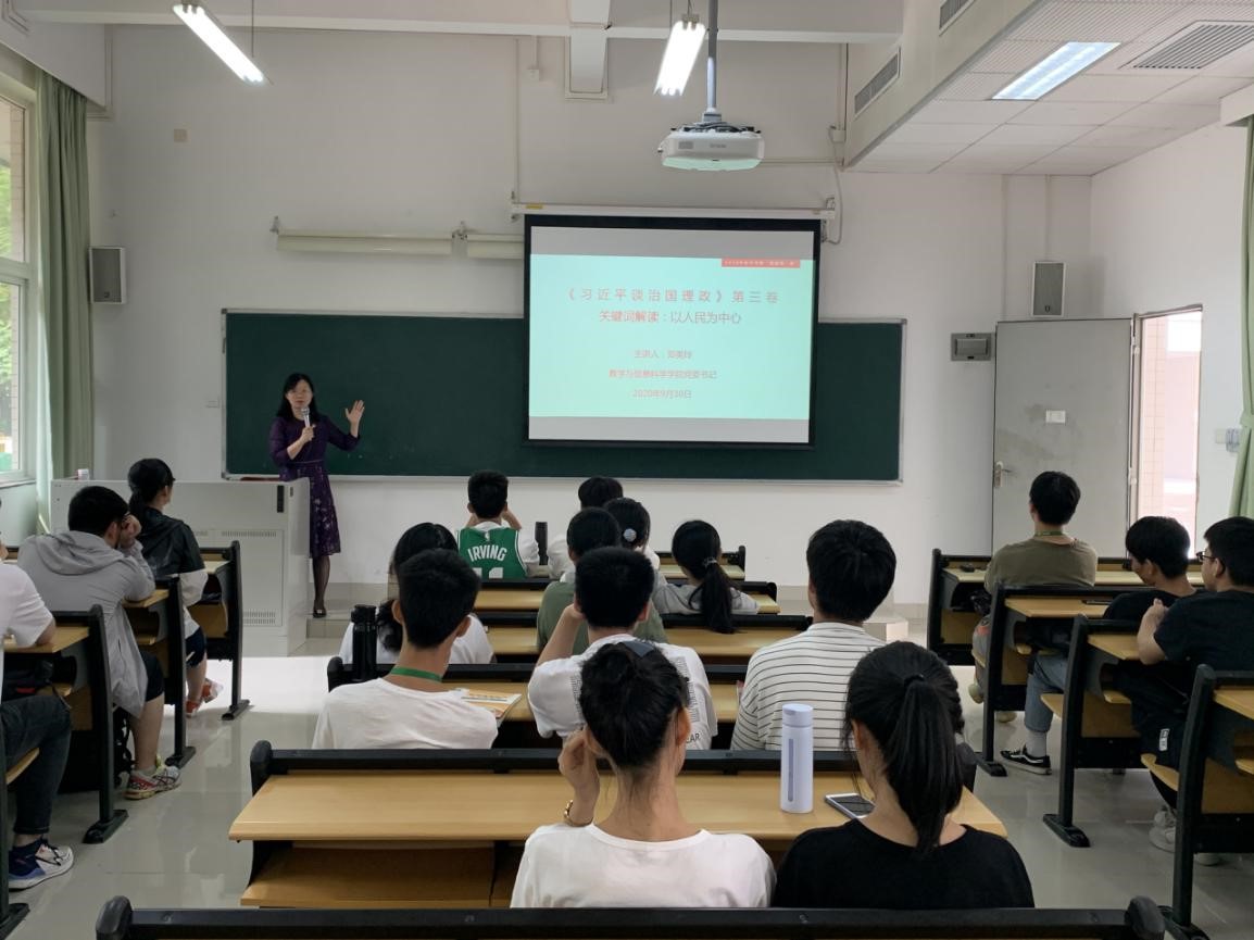 “人民是历史的创造者、人民是真正的英雄”。课堂上,郑美玲带领同学们重点学习了《习近平谈治国理政》第三卷第四专题《坚持以人民为中心》相关内容,指出《习近平谈治国理政》第三卷与第一卷、第二卷的一个共同之处,就是“人民至上”这条红线一以贯之。《坚持以人民为中心》专题共收录《我们的目标就是让全体中国人都过上更好的日子》、《人民是我们党执政的最大底气》、《始终把人民放在心中最高位置》、《我将无我,不负人民》四篇重要著作,充分彰显了习近平总书记执政为民的博大情怀,以及深厚的人民情怀和坚定的人民立场。郑美玲表示,通过认真学习《习近平谈治国理政》第三卷,能深刻领会到我们党近百年来所付出的一切努力、进行的一切斗争、作出的一切牺牲,都是为了人民幸福和民族复兴,希望同学们要牢记总书记的谆谆教诲,不负时代重托,不负青春韶华,勤奋学习,热爱伟大祖国,争做新时代好青年,为建设社会主义现代化强国,实现中华民族伟大复兴贡献智慧和力量。