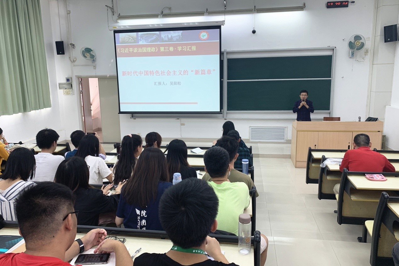10月20日中午,数学学院党委书记郑美玲为学院各党支部书记讲授党课,介绍《习近平谈治国理政》第三卷总体情况;紧接着,学院党委于当天下午邀请马克思主义学院副院长吴阳松教授为师生代表作专题辅导报告;各党支部、班级也通过组织生活会、主题班会的形式开展专题学习,掀起了师生们学习《习近平谈治国理政》第三卷的热潮,师生们还纷纷畅谈学习体会。