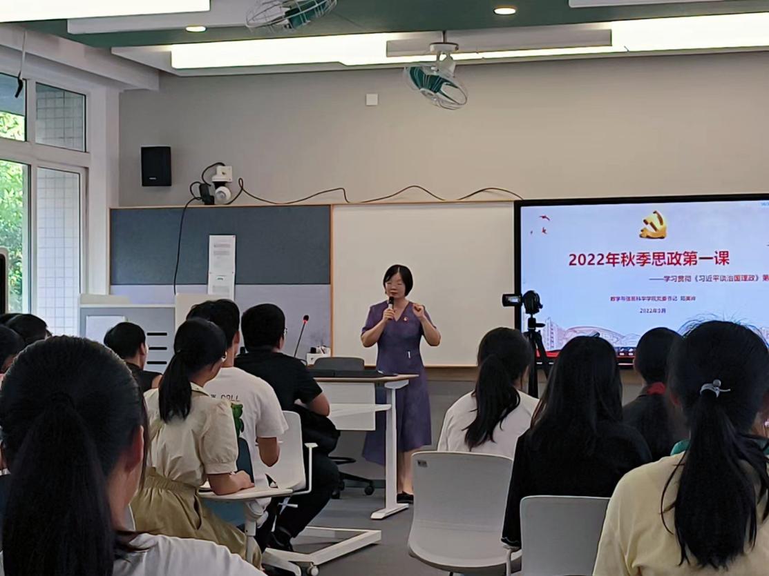党委书记郑美玲在理南314给数学223班同学们主讲2022年秋季“思政第一课”,以学习贯彻《习近平谈治国理政》第四卷为主要内容,带领同学们感悟习近平新时代中国特色社会主义思想真理伟力、思想伟力、实践伟力,引导同学们始终牢记习近平总书记的殷切嘱托。