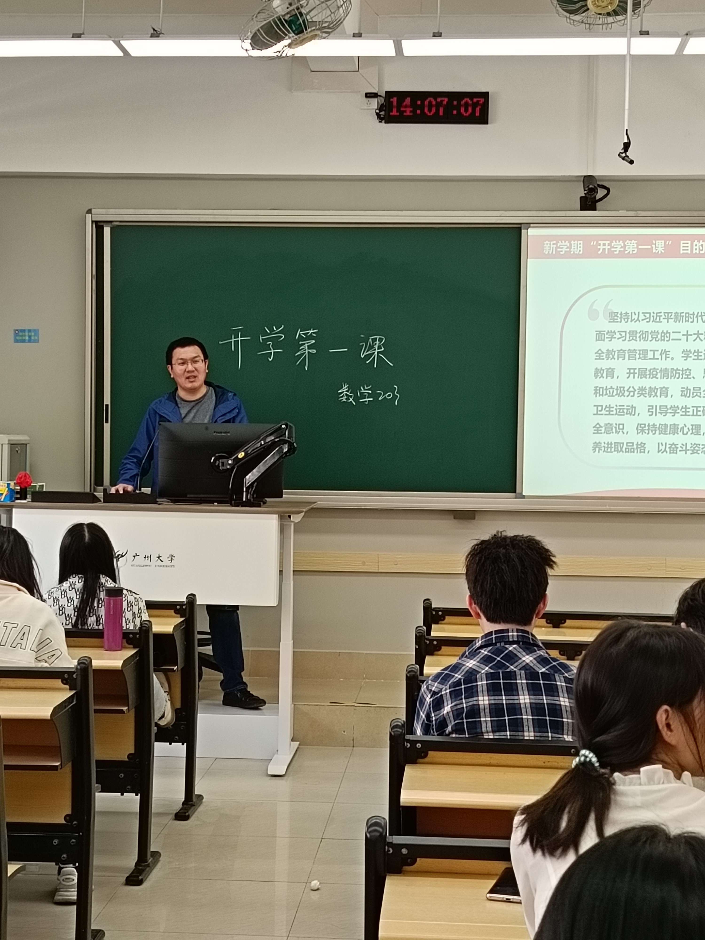 信安201班班主任周权老师在文新623召开“开学第一课”主题班会。周老师特别强调开学要做到“三个心”:收心,安心,放心。收心即假期过后将心思从娱乐转移到学习上,安心即做好学生本职工作安心学习,放心即多与家长沟通交流学习生活近况,让家长放心。