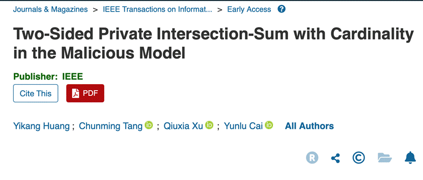 唐春明教授信息安全团队在安全多方计算(MPC)领域取得研究结果,相关成果以“Two-Sided Private Intersection-Sum with Cardinality in the Malicious Model”为题,发表于信息安全领域国际顶级期刊《IEEE Transactions on Information Forensics and Security》(IEEE TIFS)。